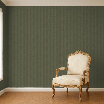 Finely textured non-woven wallpaper, imitation tweed striped fabric, shades of burgundy, semi-glossy blue, yellow-green. Stripes approx. 6-7 cm