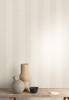 Finely textured non-woven wallpaper, imitation tweed striped fabric, shades of sand / grey-beige, metallic reflections. Stripes approx. 6-7 cm Interior photo is for illustration only - different colours.