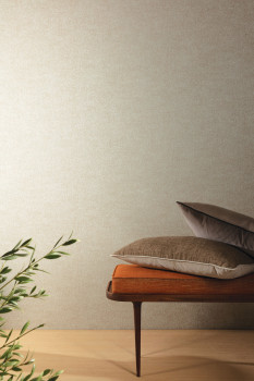 Finely textured non-woven wallpaper, imitation tweed striped fabric, shades of beige, a hint of pink, matte and gloss effect. Interior photo is for illustration only - different colours.