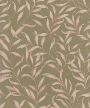 Green finely textured non-woven wallpaper with a vinyl surface, motifs of twigs, leaves, in pink shades.