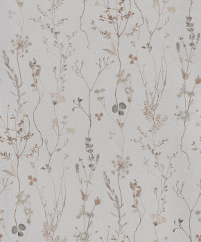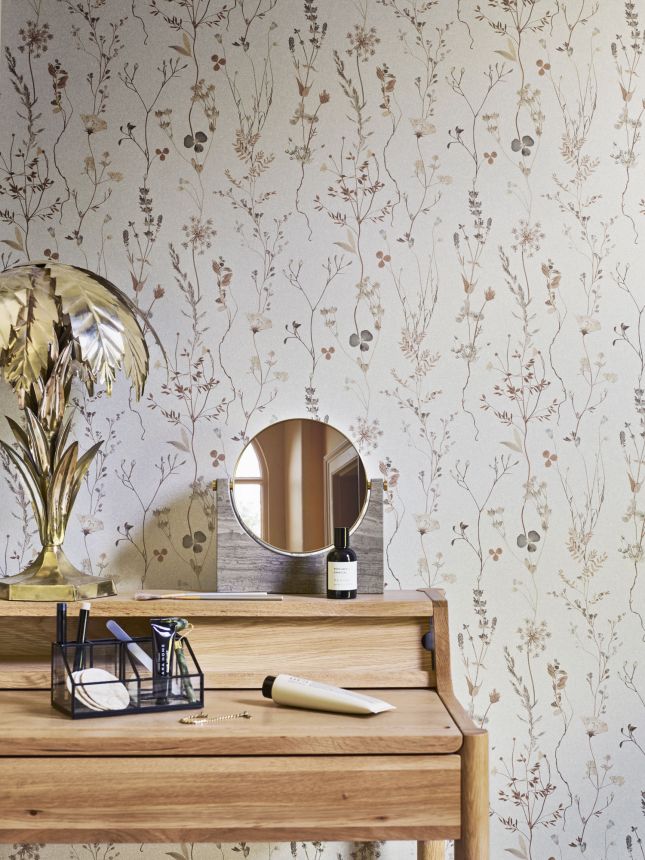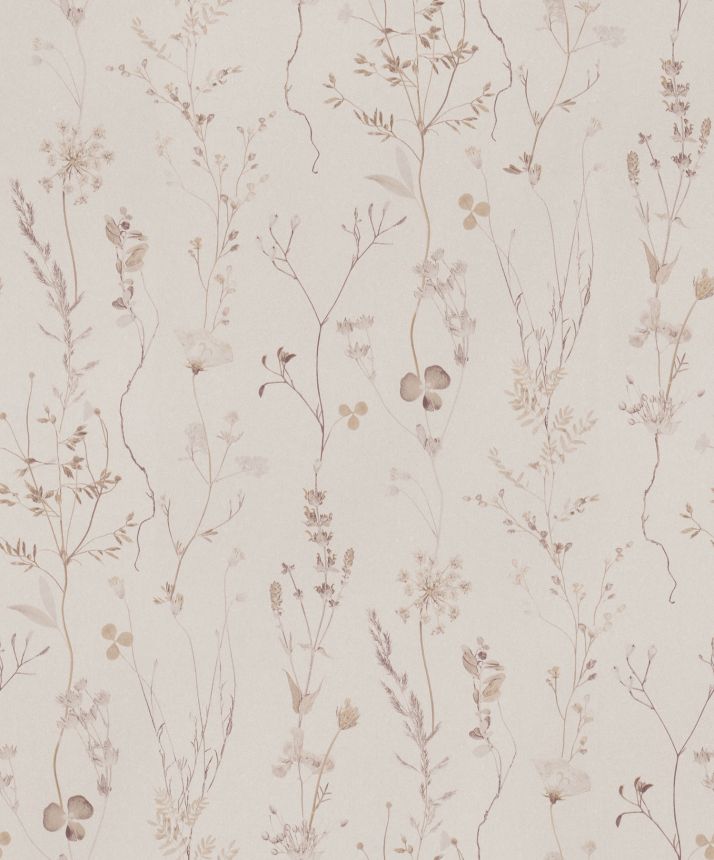 Beige non-woven wallpaper with a vinyl surface, a pattern of delicate meadow flowers in shades of purple and brown. Interior photo is for illustration only - different colours.