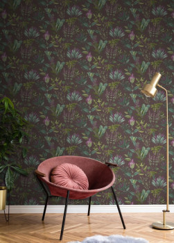 Brown-purple, background, pattern shades of green, pink, fine fabric texture.