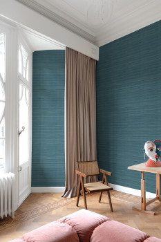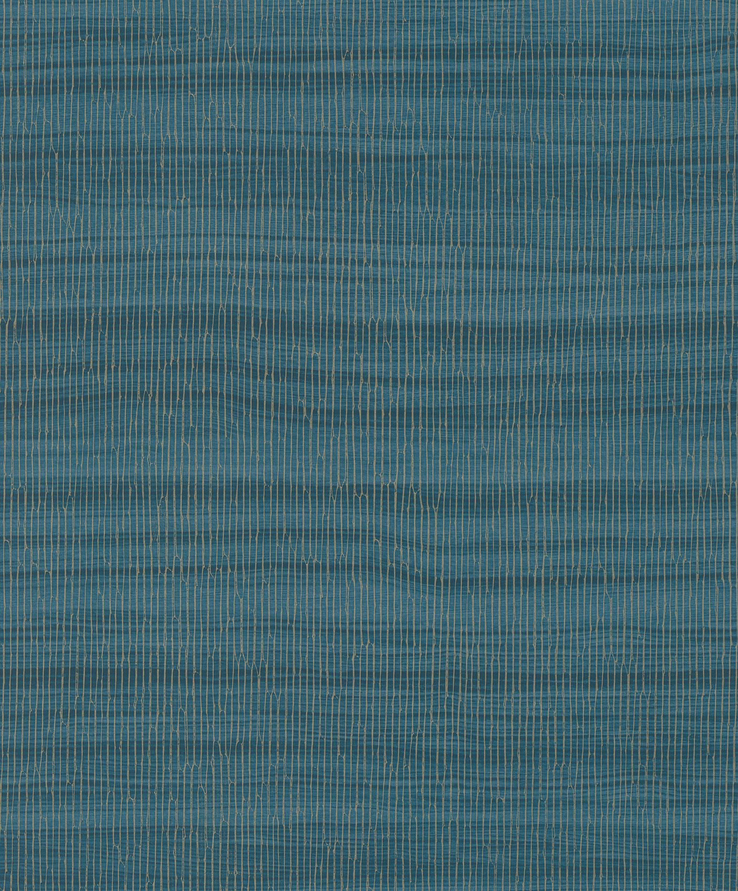 Coarsely textured non-woven wallpaper with vinyl surface, blue background, gold embossed lines.