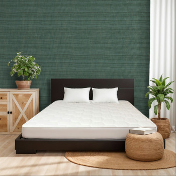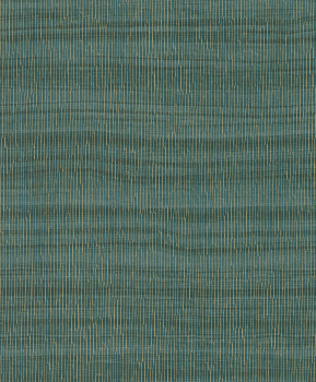 Coarsely textured non-woven wallpaper with vinyl surface, green background, gold embossed lines.