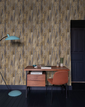 Wood imitation non-woven wallpaper in shades of brown, gray and blue.