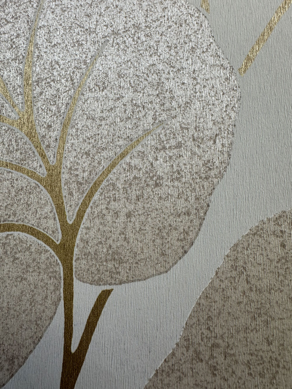 Semi-gloss grey-cream non-woven wallpaper with leaves, golden stems. Interior photo is for illustration only.