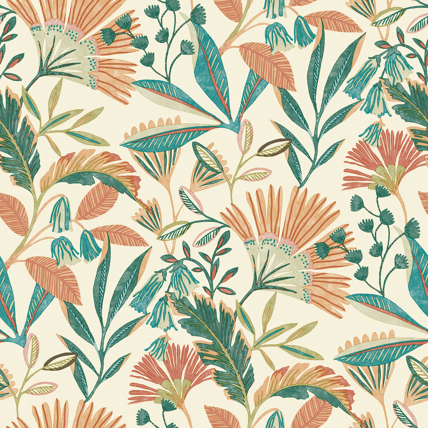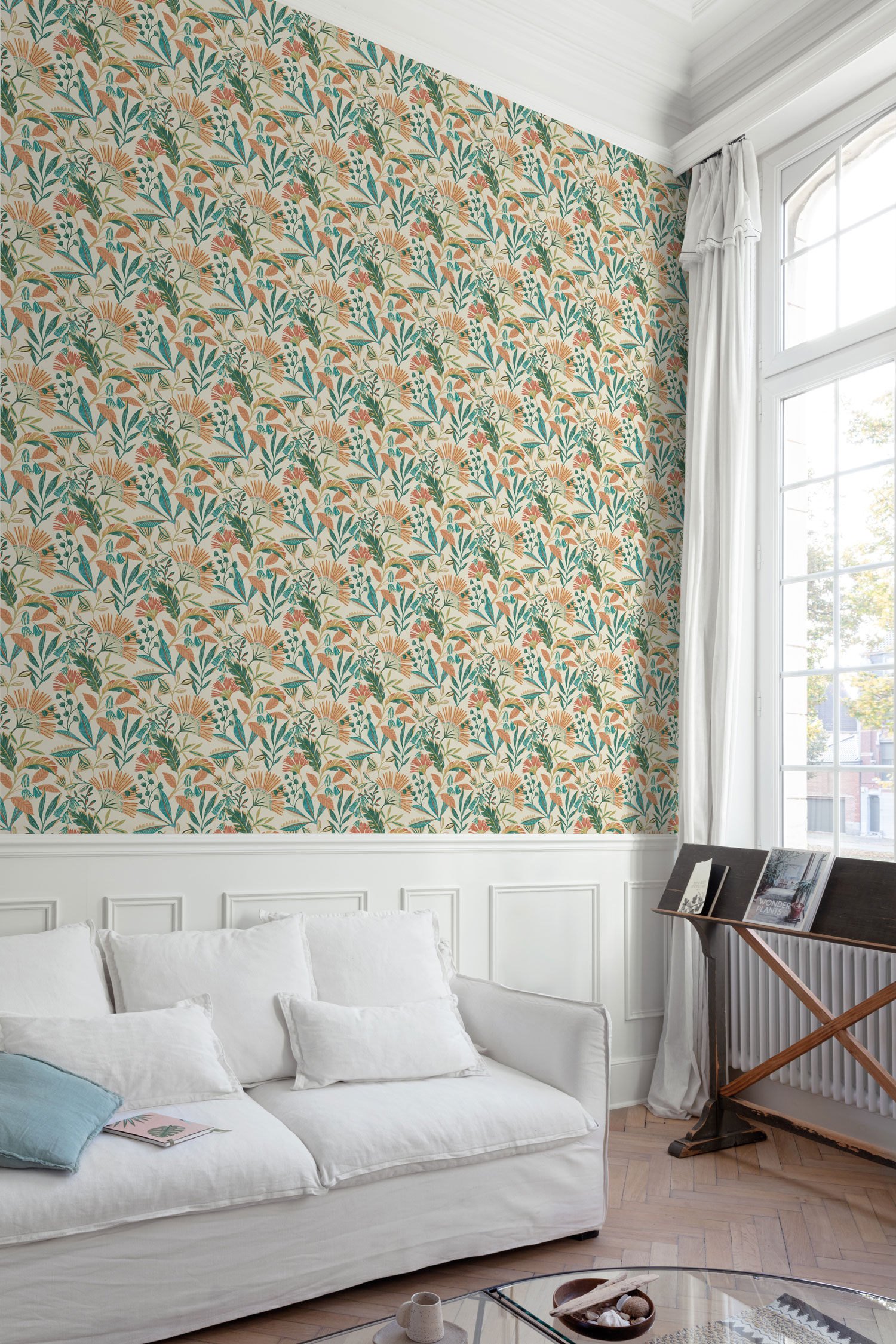 Non-woven wallpaper - flowers and leaves in shades of orange, brick and green on a cream background.