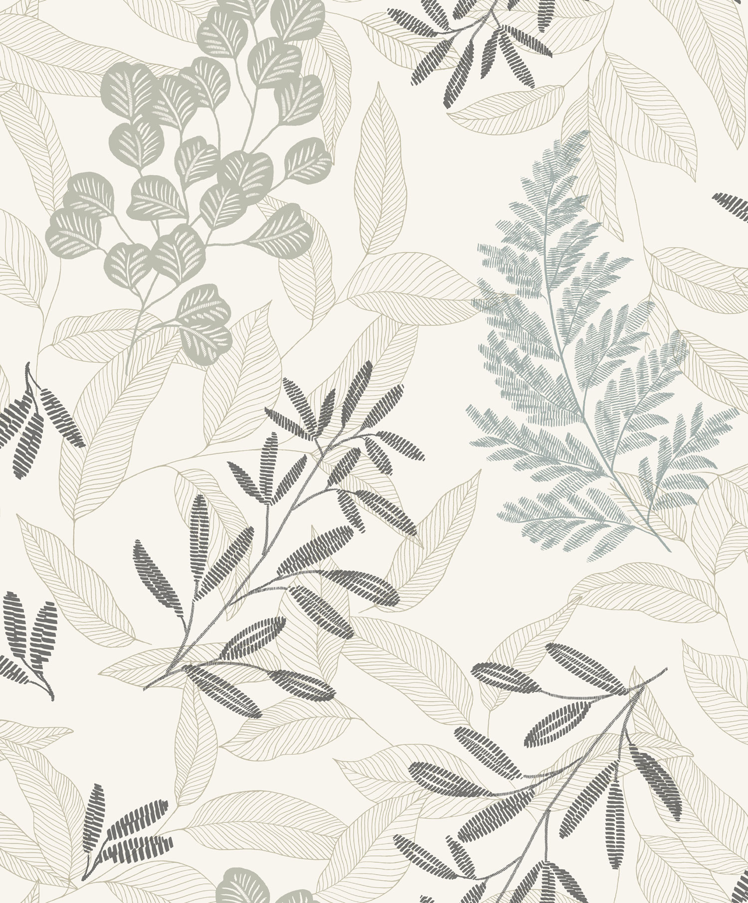 White wallpaper with twigs and leaves, A63901, Ciara, Grandeco