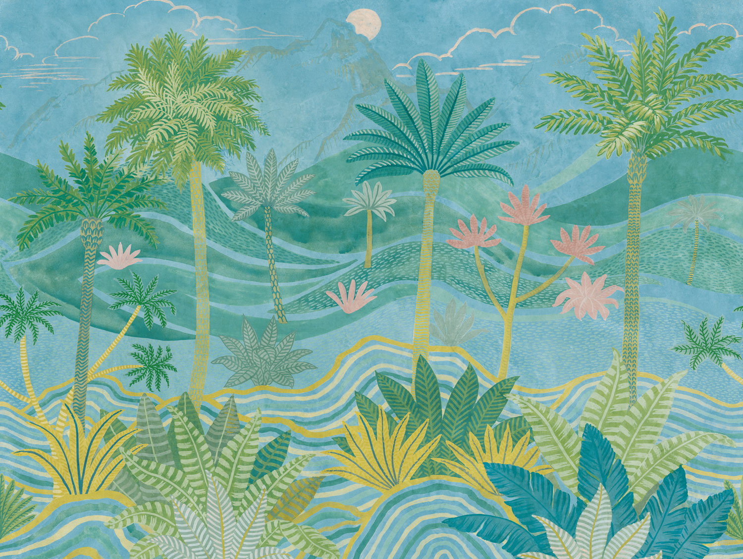 Non-woven wall mural, landscape motif with palm trees. The wallpaper has a continuous pattern, for a larger width you just need to buy another piece. 7 panels 0.53 x 2.8 m