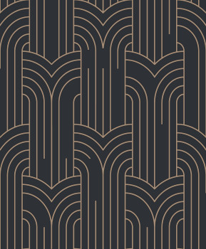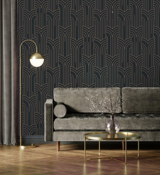 Black non-woven wallpaper with vinyl surface, Art Deco style pattern, smooth metallic shiny lines.