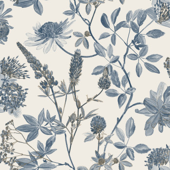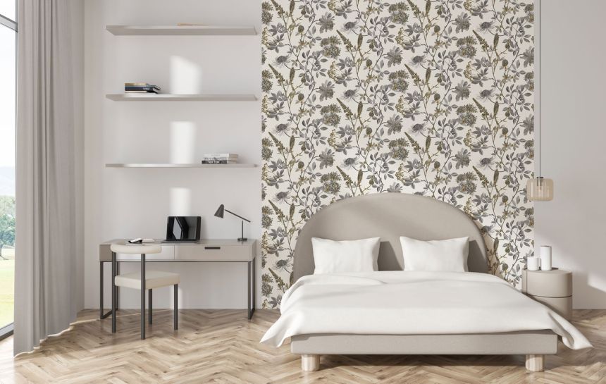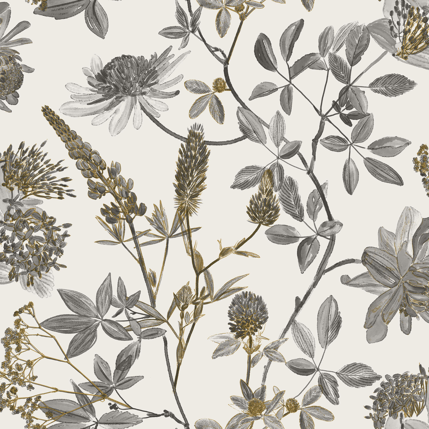 White non-woven wallpaper, vinyl backing, gray-black pattern of meadow flowers with gold outlines and details.