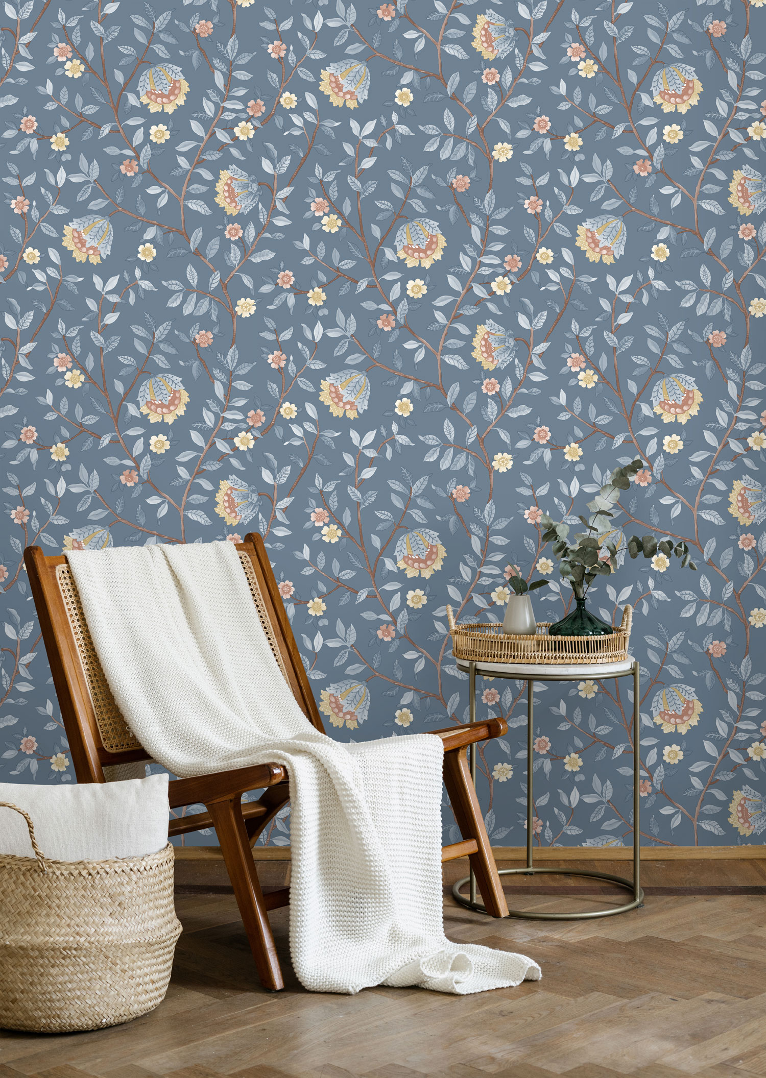 Blue non-woven wallpaper, flower motifs in shades of blue, brown and ocher.