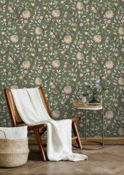 Green non-woven wallpaper, flower motifs in shades of green, pink and ocher.