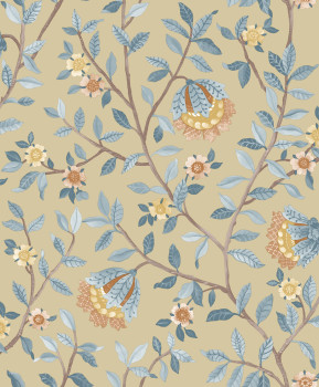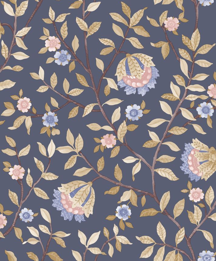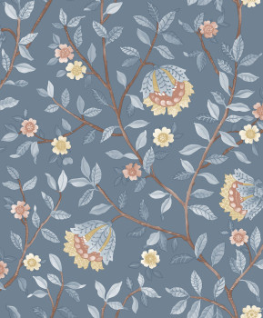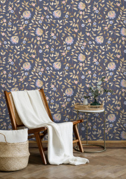 Blue non-woven wallpaper, flower motifs in shades of blue, brown, beige and pink.