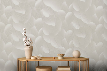 Grey-beige non-woven wallpaper, golden outlines of leaves.