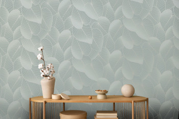Grey-green non-woven wallpaper, golden outlines of leaves.