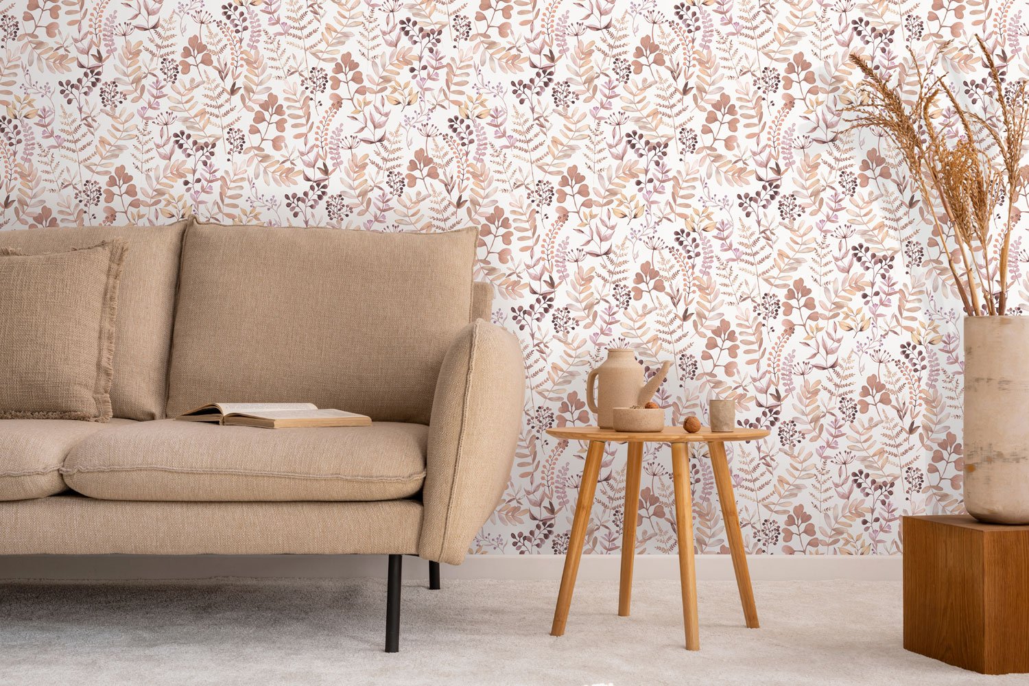 White non-woven wallpaper, leaf motifs in shades of pink, brown and lilac.