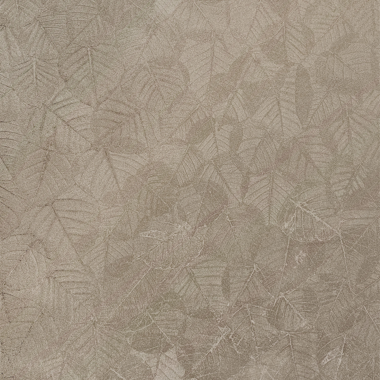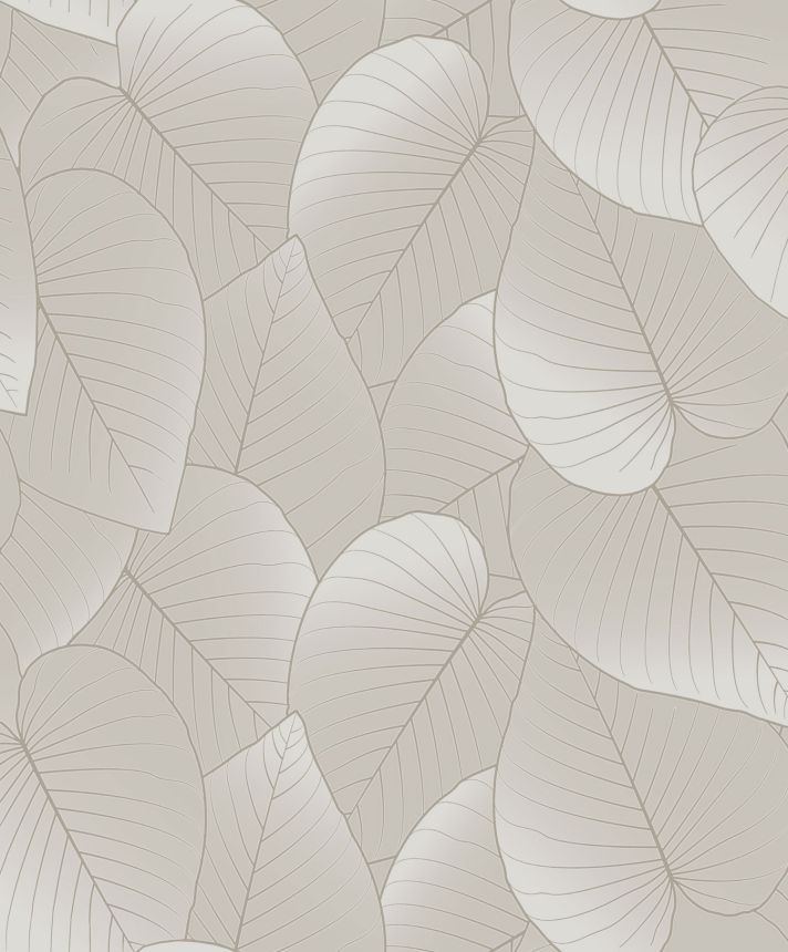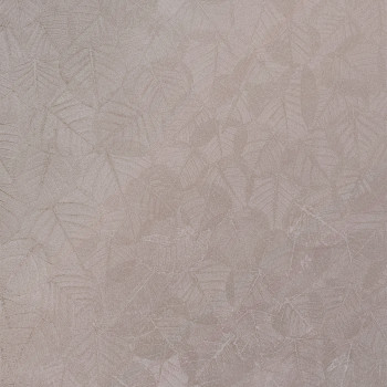 Semi-gloss, subtly embossed, gold non-woven wallpaper with leaves.