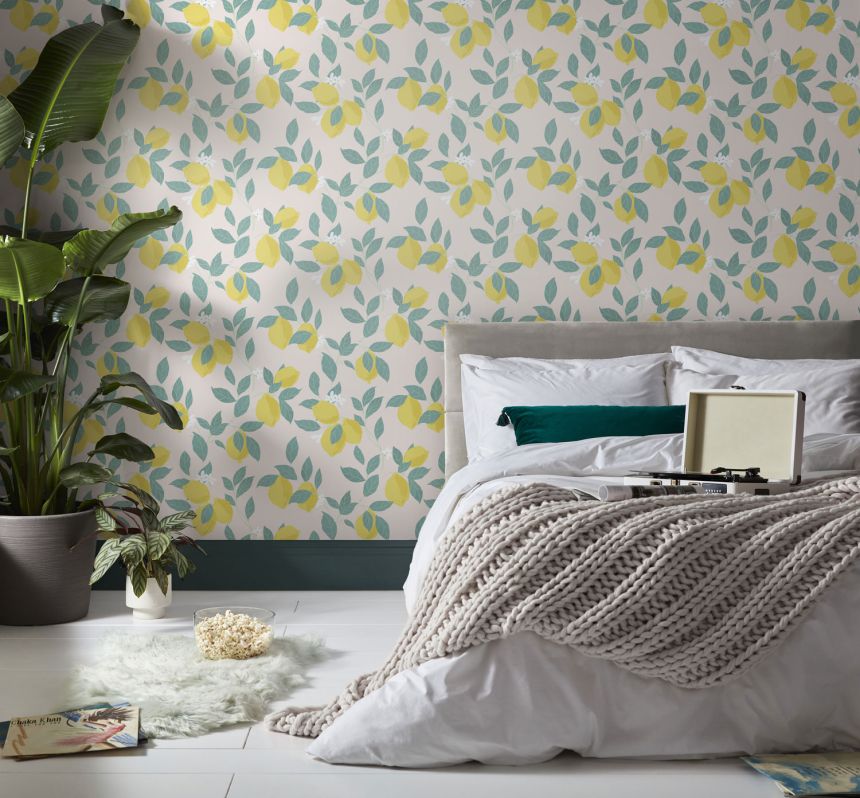 Smooth pink non-woven wallpaper, lemon tree motif.