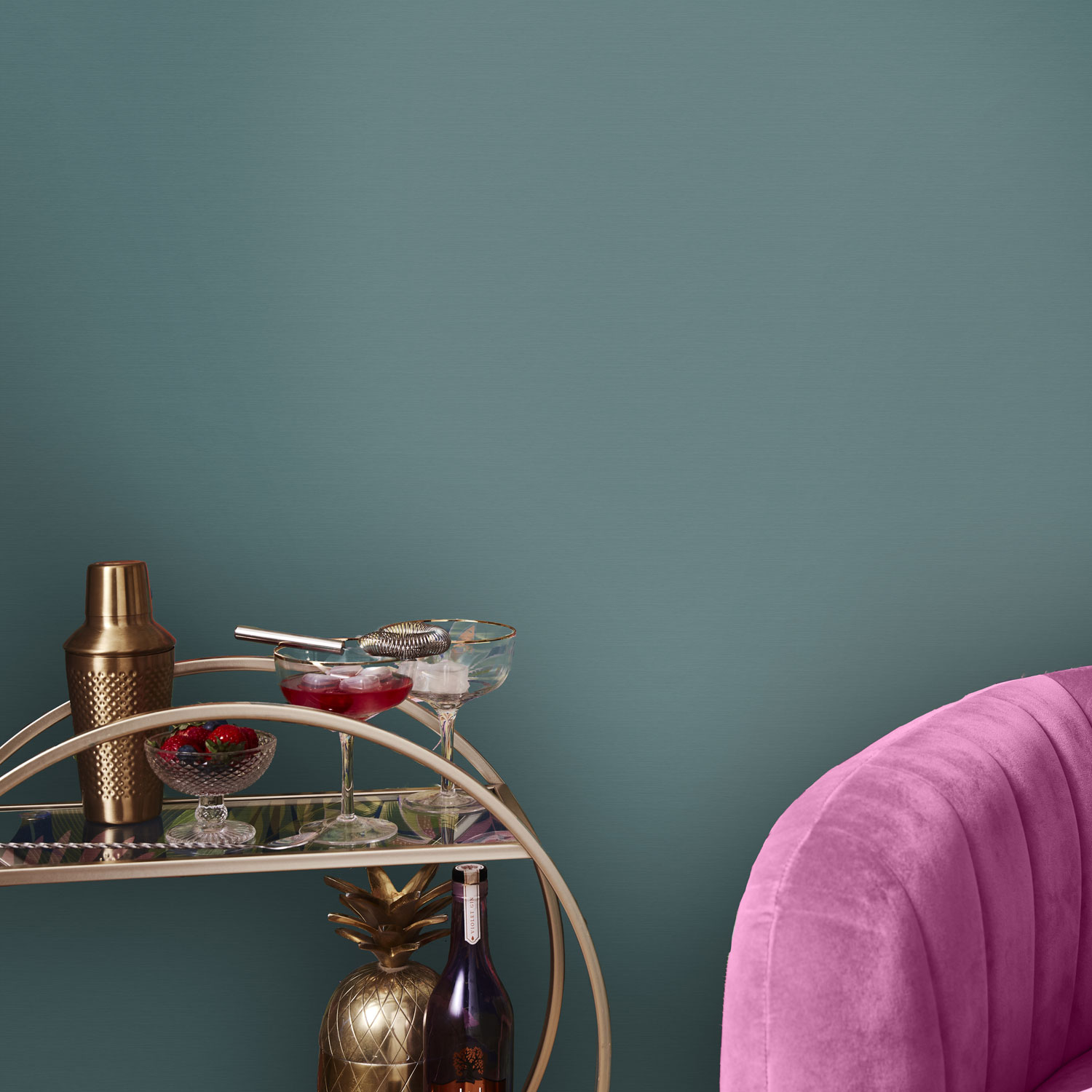 Finely textured, turquoise non-woven wallpaper, fabric imitation.