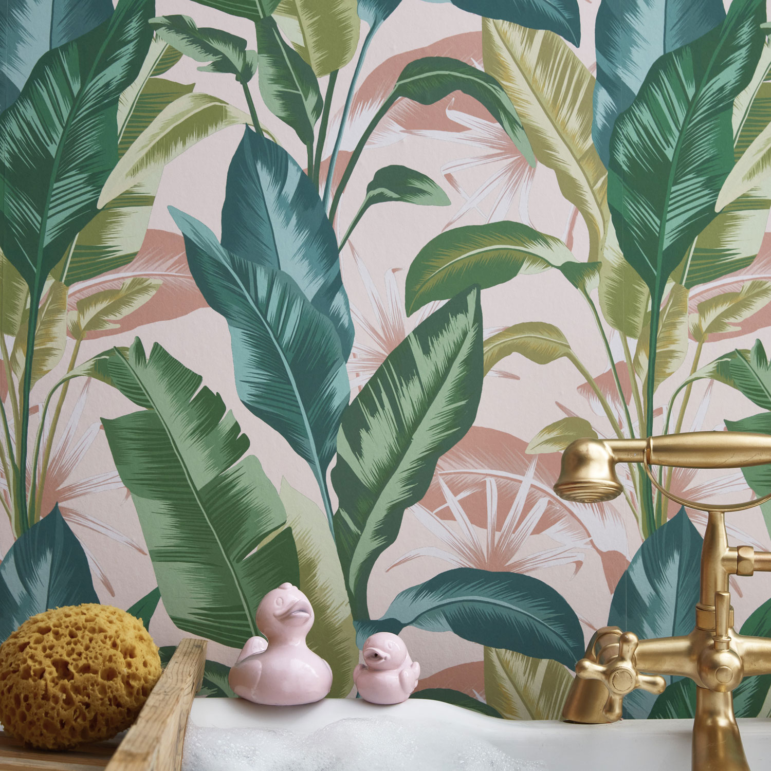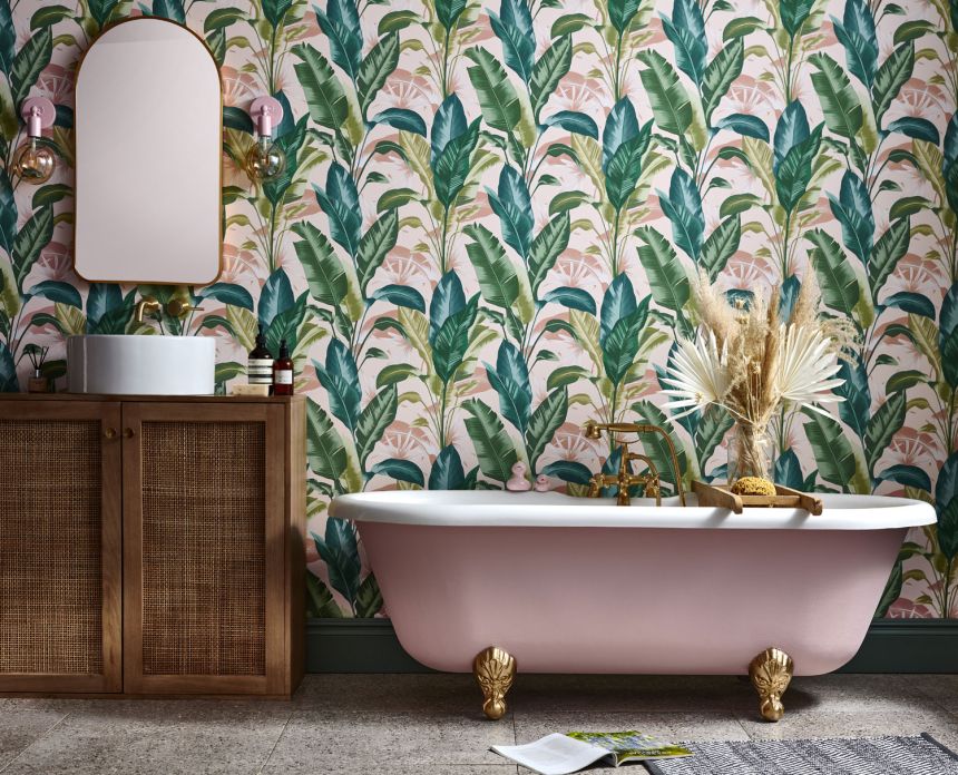 Smooth pink non-woven wallpaper, green and pink tropical leaves.