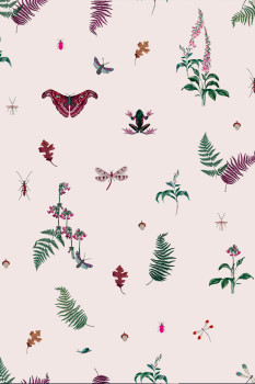 Cream non-woven wallpaper, motifs of fern leaves, flowers and animals.