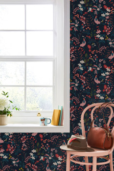 Dark blue non-woven wallpaper, motif of flowers, leaves, twigs and pheasants.