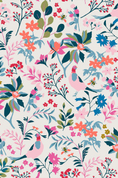 Cream non-woven wallpaper, motif of flowers, leaves, twigs and pheasants.