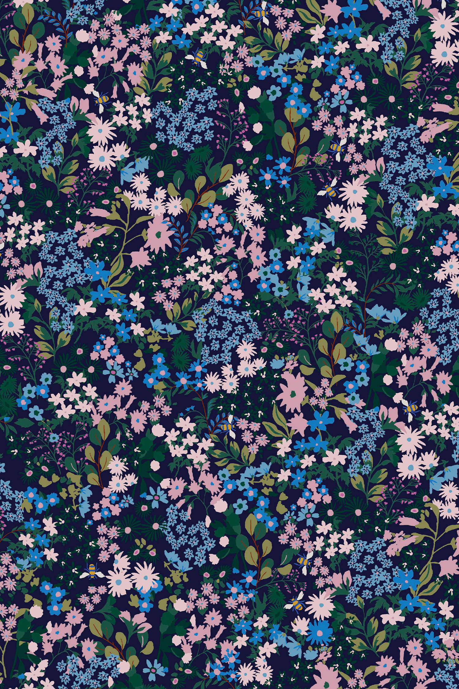 Dark blue non-woven wallpaper, motifs of meadow flowers.