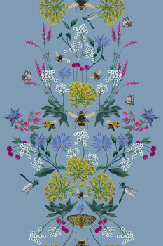 Blue non-woven wallpaper, motifs of meadow flowers, butterflies, dragonflies and bees.
