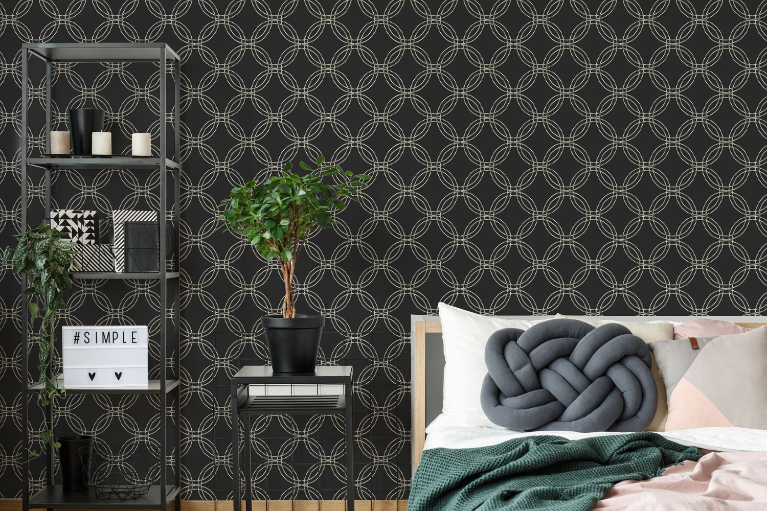Smooth black non-woven wallpaper with a rose gold geometric pattern.