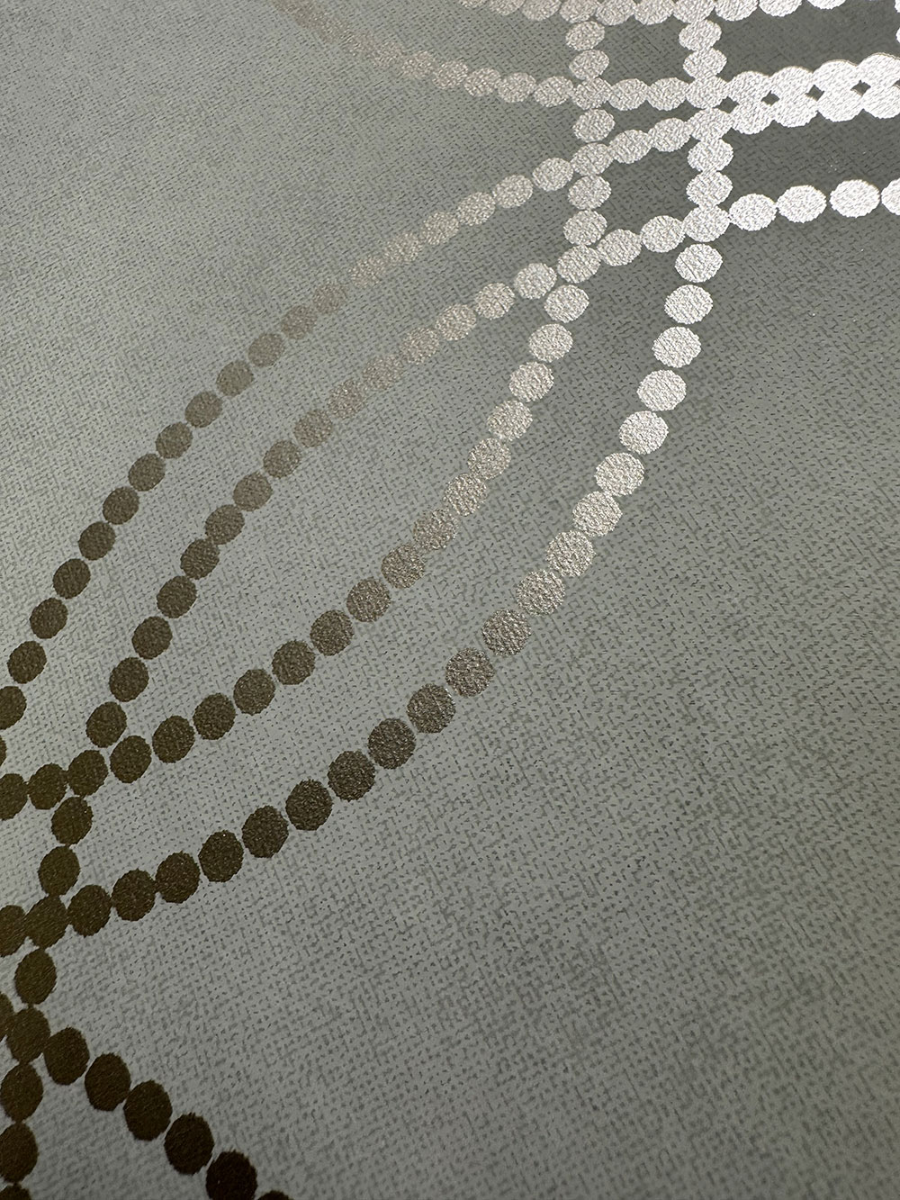 Smooth sage green non-woven wallpaper with a gold geometric pattern.