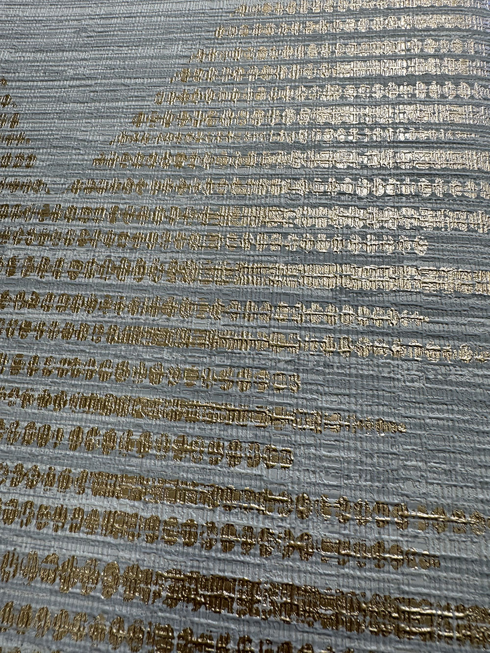Embossed, gray-beige non-woven wallpaper, geometric pattern, golden lines form diamonds.