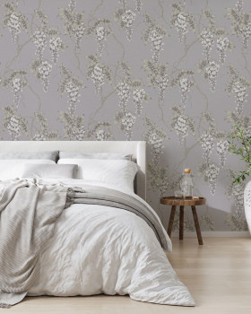 Textured gray non-woven wallpaper, motif of blossoming Wisteria, flowers in semi-glossy metallic shades of green, gold and gray-silver.