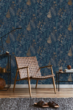 Dark blue textured non-woven wallpaper, imitation of stucco plaster, decor of leaves and flowers in shades of blue, gray and bronze.