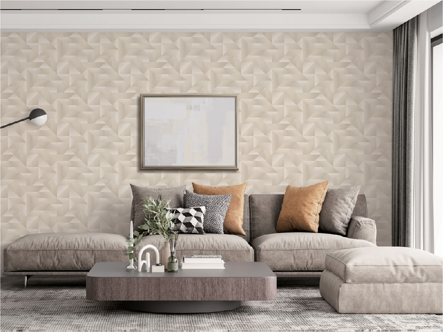 Gently embossed semi-gloss beige non-woven wallpaper with vinyl surface, geometric 3D pattern.