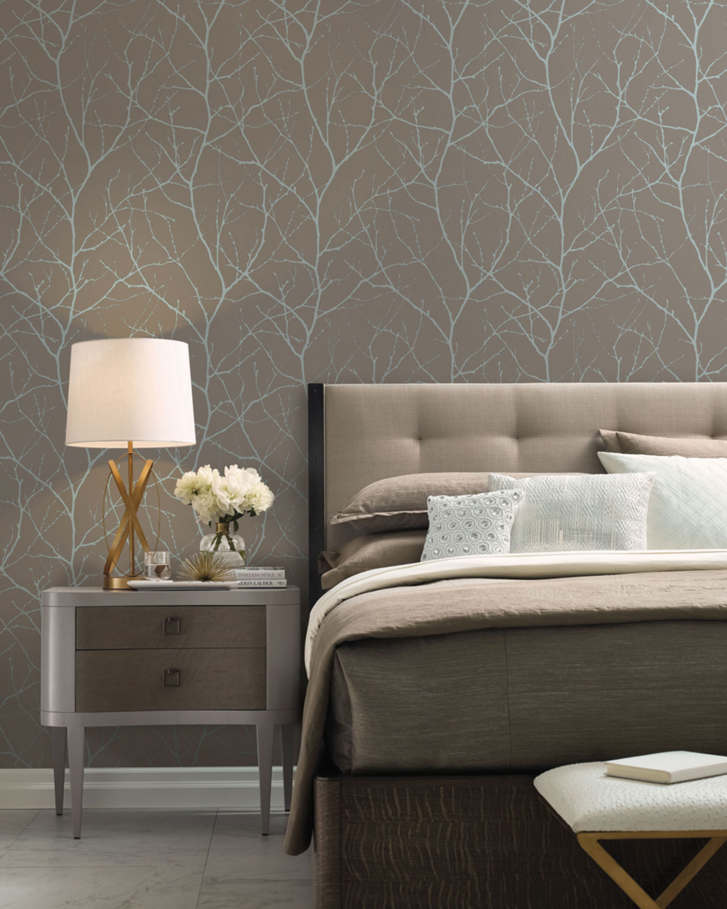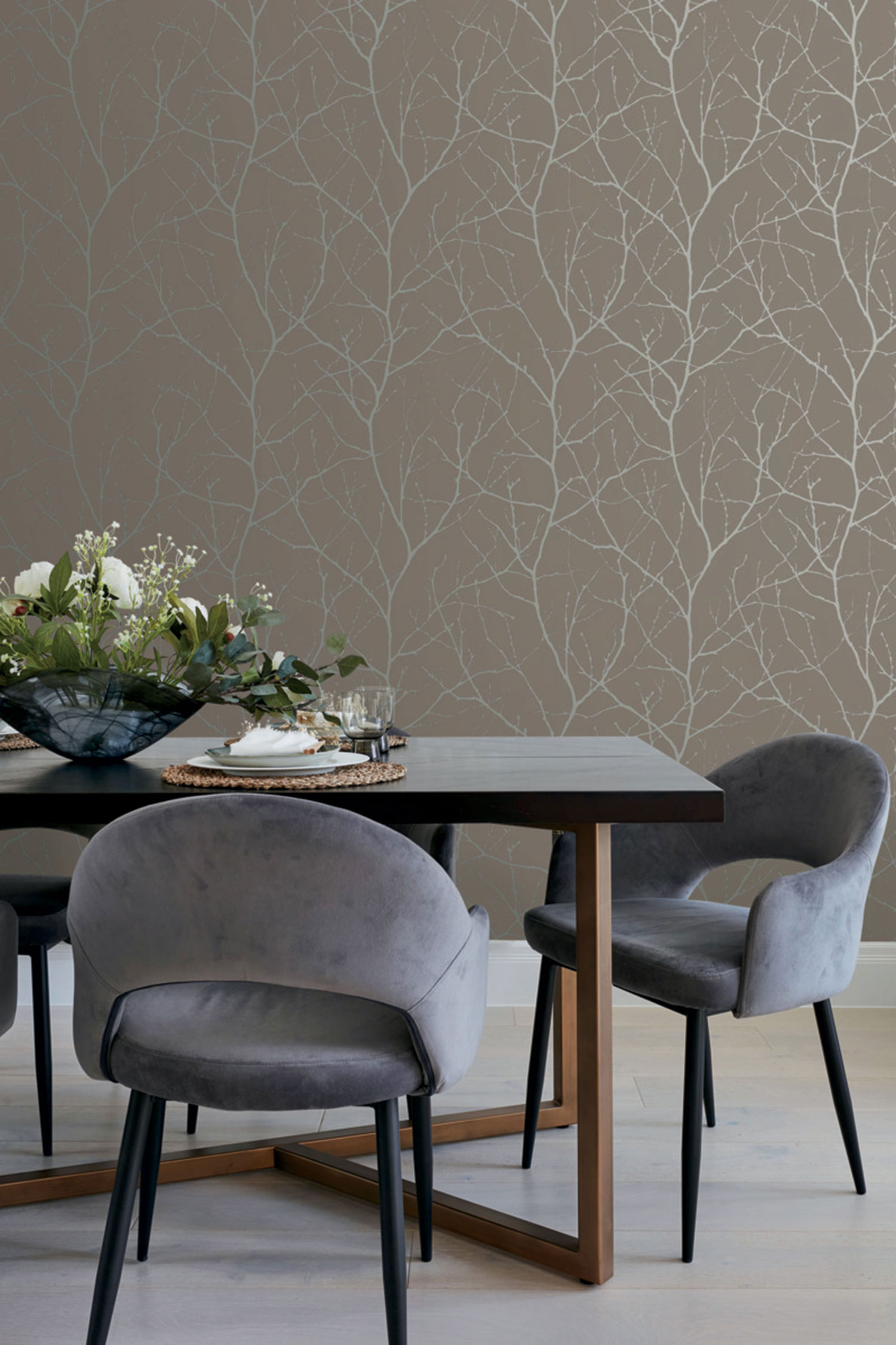 Brown/mocha non-woven wallpaper, smooth background, embossed silver tree branches.