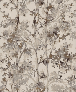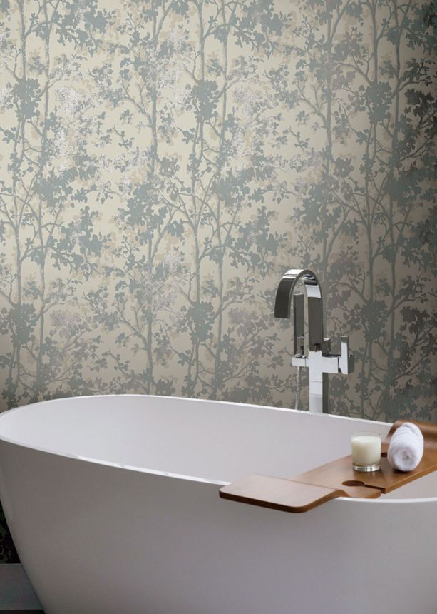Beige non-woven wallpaper, embossed floral pattern in metallic silver, gray outlines.