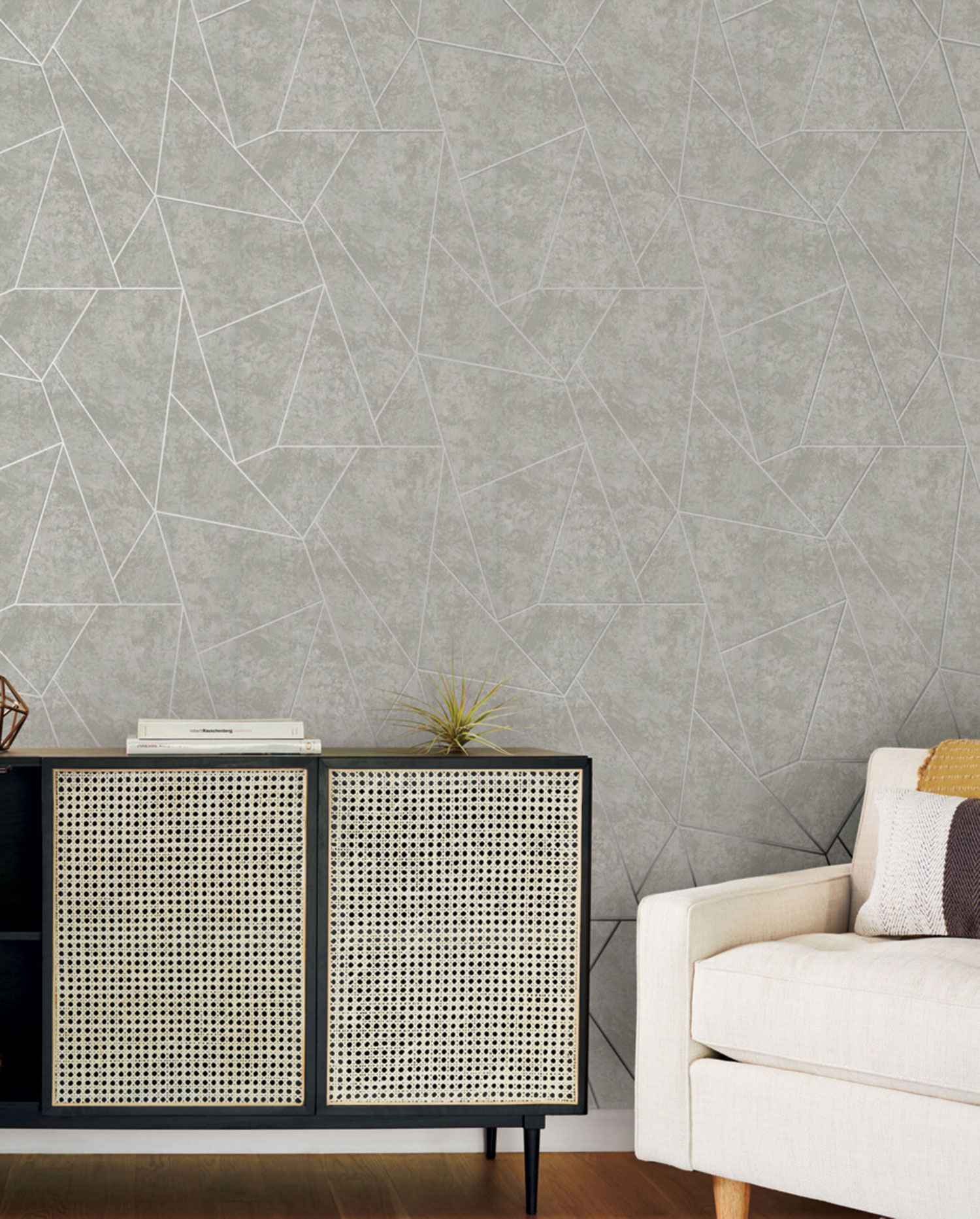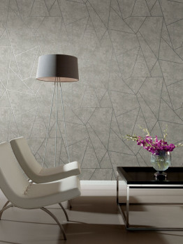 Gray marbled non-woven wallpaper, embossed silver lines form geometric patterns.