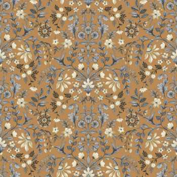 Matte, dark ocher non-woven wallpaper with an ornamental floral pattern in blue and beige on a background imitating fine plaster.