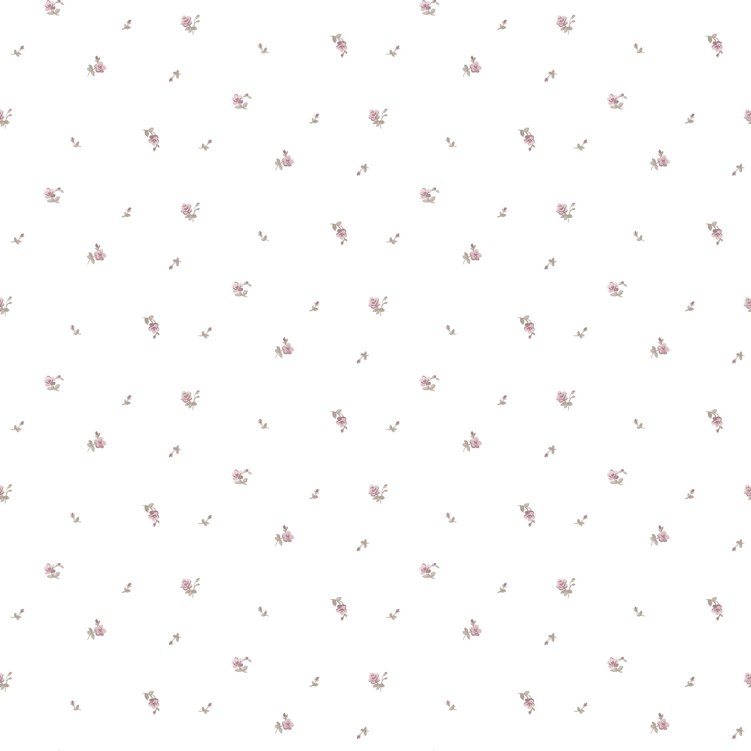 Matte, white non-woven wallpaper with small pink roses on a white background imitating fine plaster.
