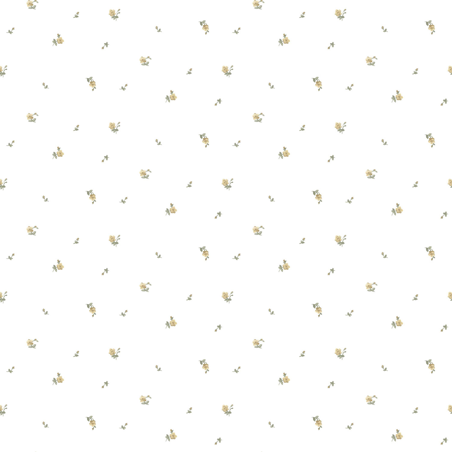 Matte, white non-woven wallpaper with small yellow roses on a white background imitating fine plaster.