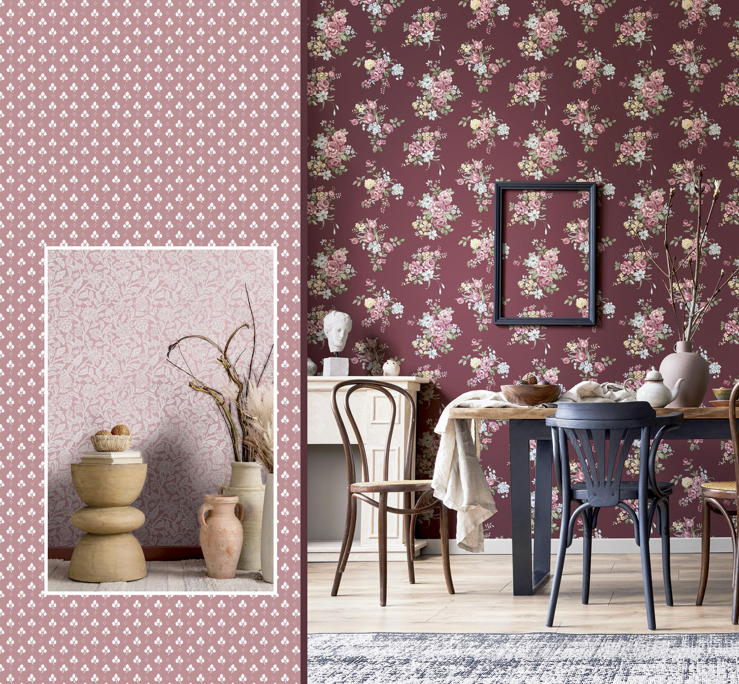 Floral and checkered wallpapers with a touch of tradition