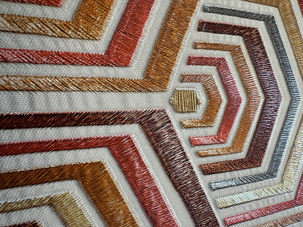 Luxury geometric non-woven wallpaper with vinyl surface. Beige background, pattern in shades of red, orange, grey, metallic sheen.