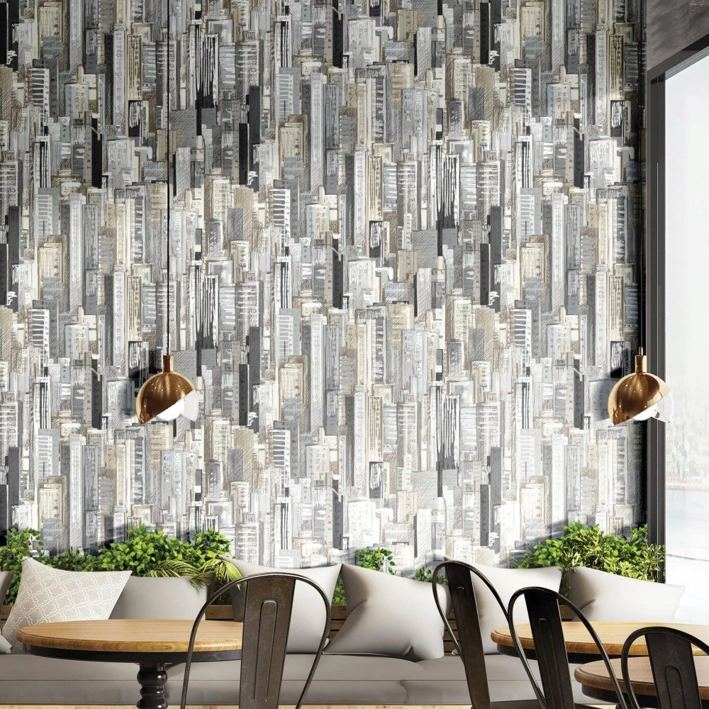 Non-woven wallpaper not only for teenagers, modern city theme in shades of gray, black, brown, beige and silver.