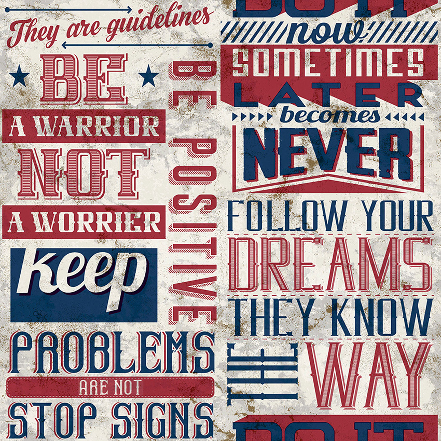 Non-woven wallpaper not only for teenagers, grey-beige background, inscriptions in shades of blue and burgundy. Interior photo is for illustration only.