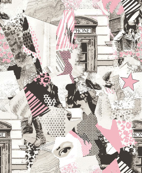 Collage non-woven wallpaper not only for teenagers, in shades of white, beige, pink and black.