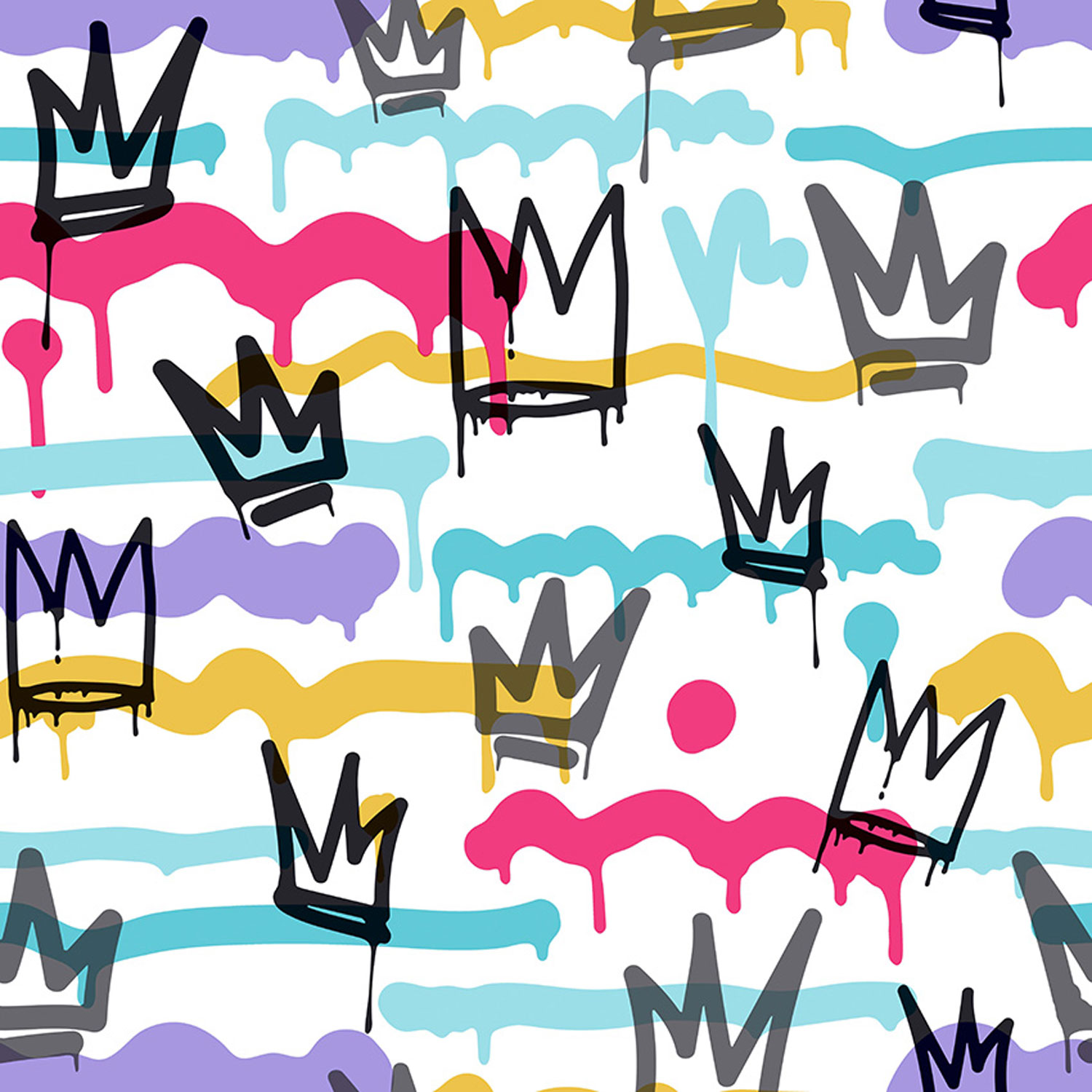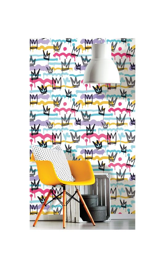 Smooth white non-woven wallpaper, Street Art - shades of turquoise, purple, pink and gold.