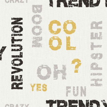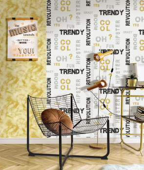 Non-woven wallpaper not only for teenagers, gray-white background, inscriptions in shades of black, silver and gold.