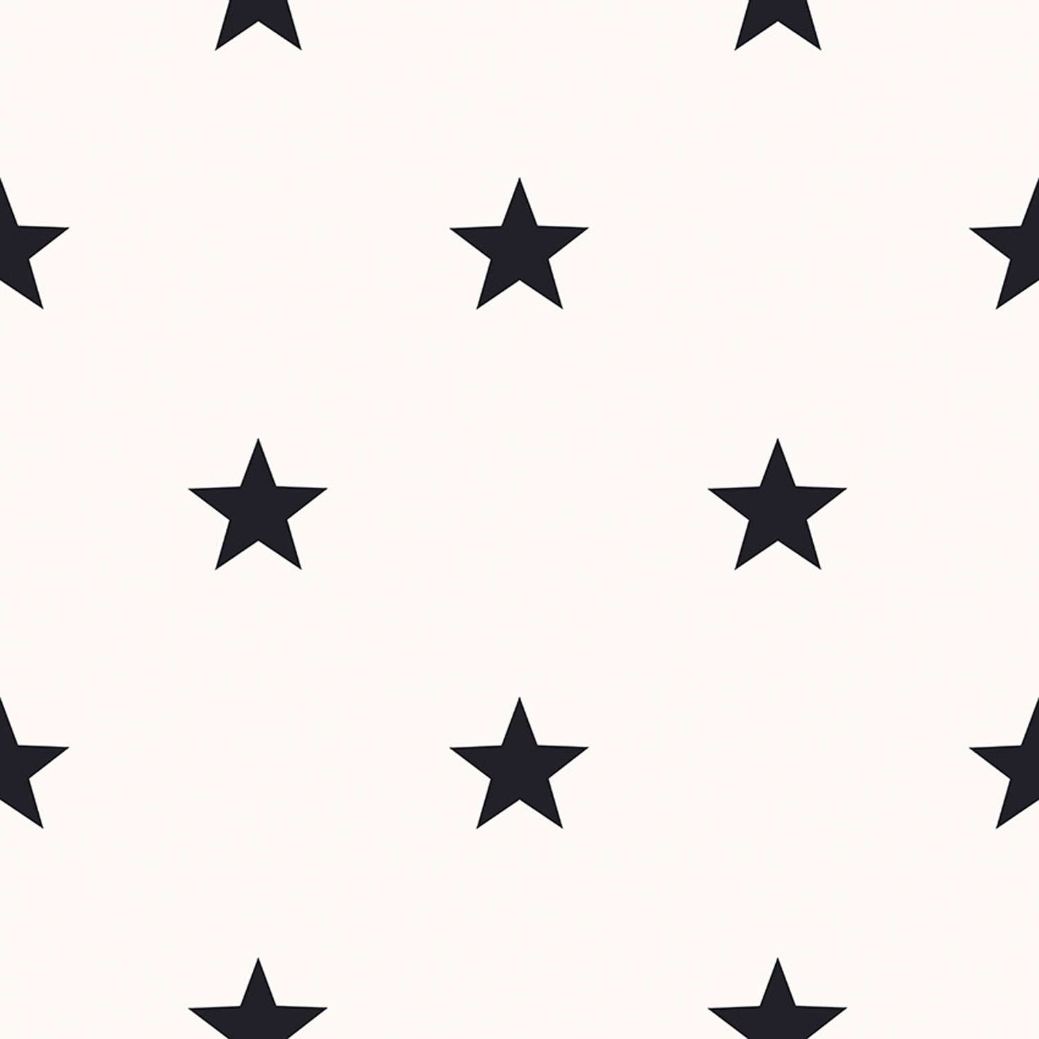 Smooth white non-woven wallpaper, black stars motif. Stars approx. 7cm. Interior photo is for illustration only.